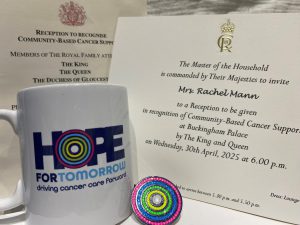 “On 11th March 2025 I received a phone call from the CEO of Hope for Tomorrow, a charity I’ve been supporting since 2017. They were inviting me to attend a community reception, hosted by the King and Queen on 30th April at Buckingham Palace. Needless to say, I was completely overwhelmed – it’s not every day you get invited to Buckingham Palace! The reception was to be held in celebration of community-based cancer support initiatives, raising awareness of the needs of cancer patients. Hope for Tomorrow plays a big part in making the lives of cancer patients a little easier, as they provide mobile cancer care and support services across the country, working in partnership with NHS Trusts. Following my own diagnosis in 2016, I know how important these units are and how crucial it is that we keep them on the road.