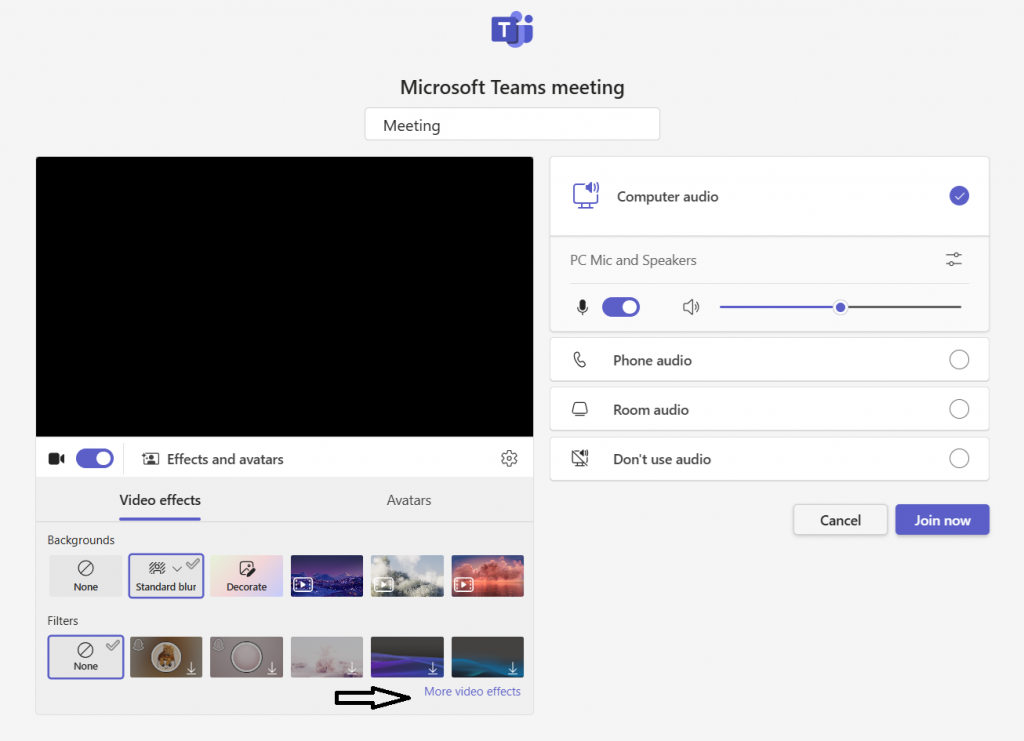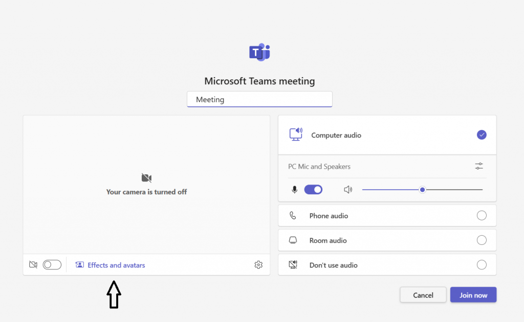 As you join a Teams call, you will see the “Effects and avatars” option under your image:
